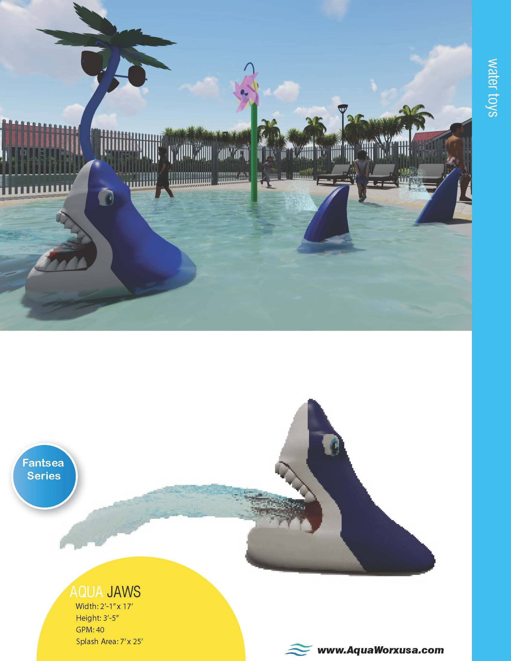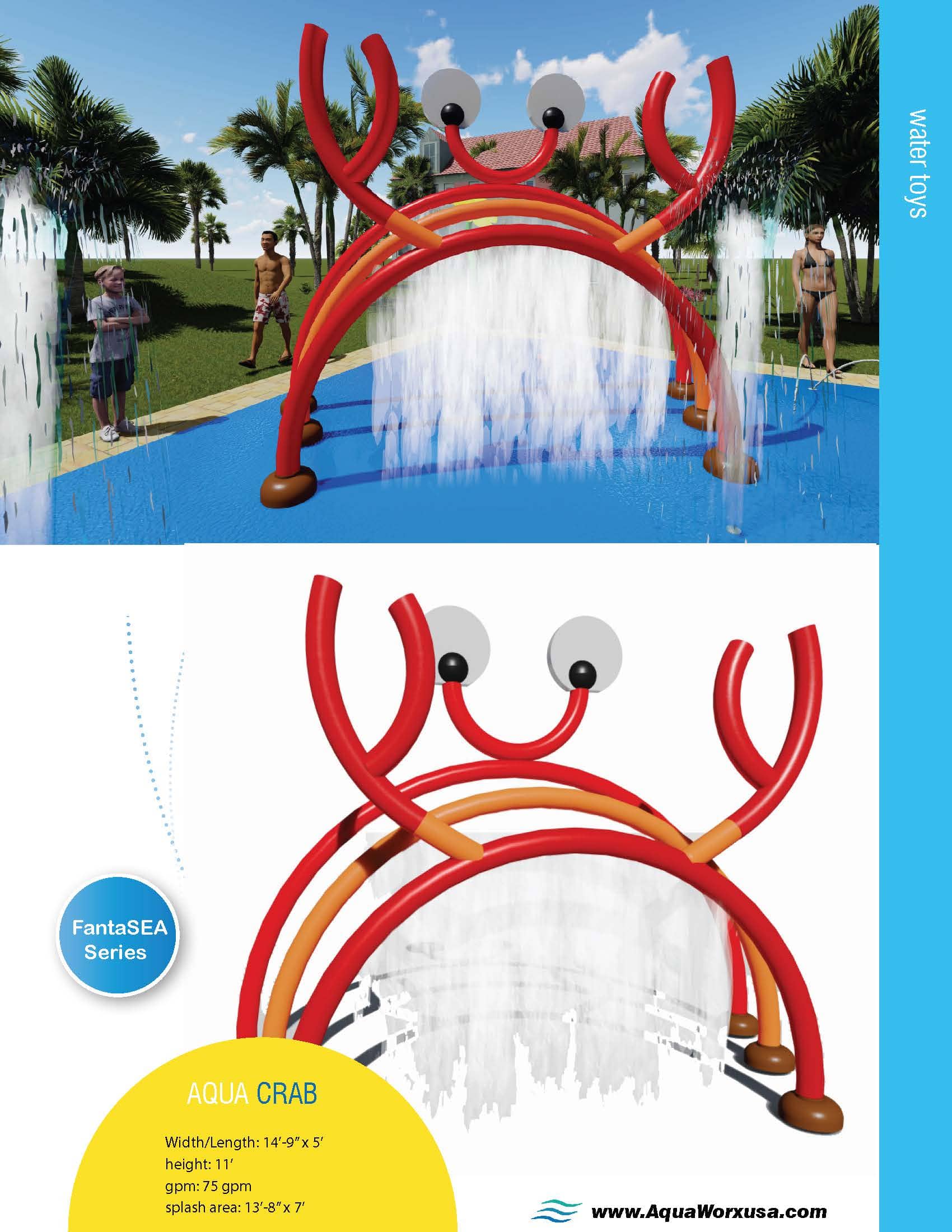 Adding to the marine-themed aquatic play experience are a variety of water toys that capture the essence of an oceanic landscape. A three-piece shark water feature sprays water from its mouth, while crab-themed water rings allow children to run through as water showers down on them. Other notable elements include a broken boat, a palm tree water feature, and a playful school of fish. Ground sprays, gum drop water features, and spraying leaf elements further enrich the aquatic environment.