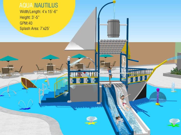 The splash pad features a custom Aqua Nautilus Pirate Ship-themed water playset, designed to spark children's imaginations. The water playground is painted with panels that resemble the walls of a pirate ship, accented with brown, yellow, and red colors. It includes interactive pirate cannons, a pirate-themed steering wheel, a showering crow's nest, and two thrilling racing water slides, complemented by rock wall steps to add to the adventure.