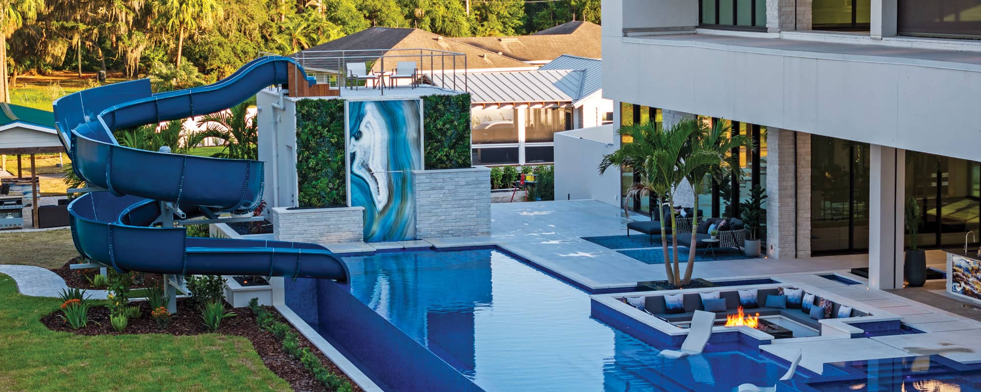 The Tampa Oasis project showcases a luxury residential vanishing-edge swimming pool designed for a waterfront home. At an impressive 192 feet, it is the longest residential pool in the surrounding area. The swimming pool is covered in 6,400 square feet of blue tile, creating a tranquil aesthetic. The swimming pool's luxurious landscape includes fire pits, spas, and a show-stopping curved waterslide that serves as the centerpiece of the outdoor oasis.