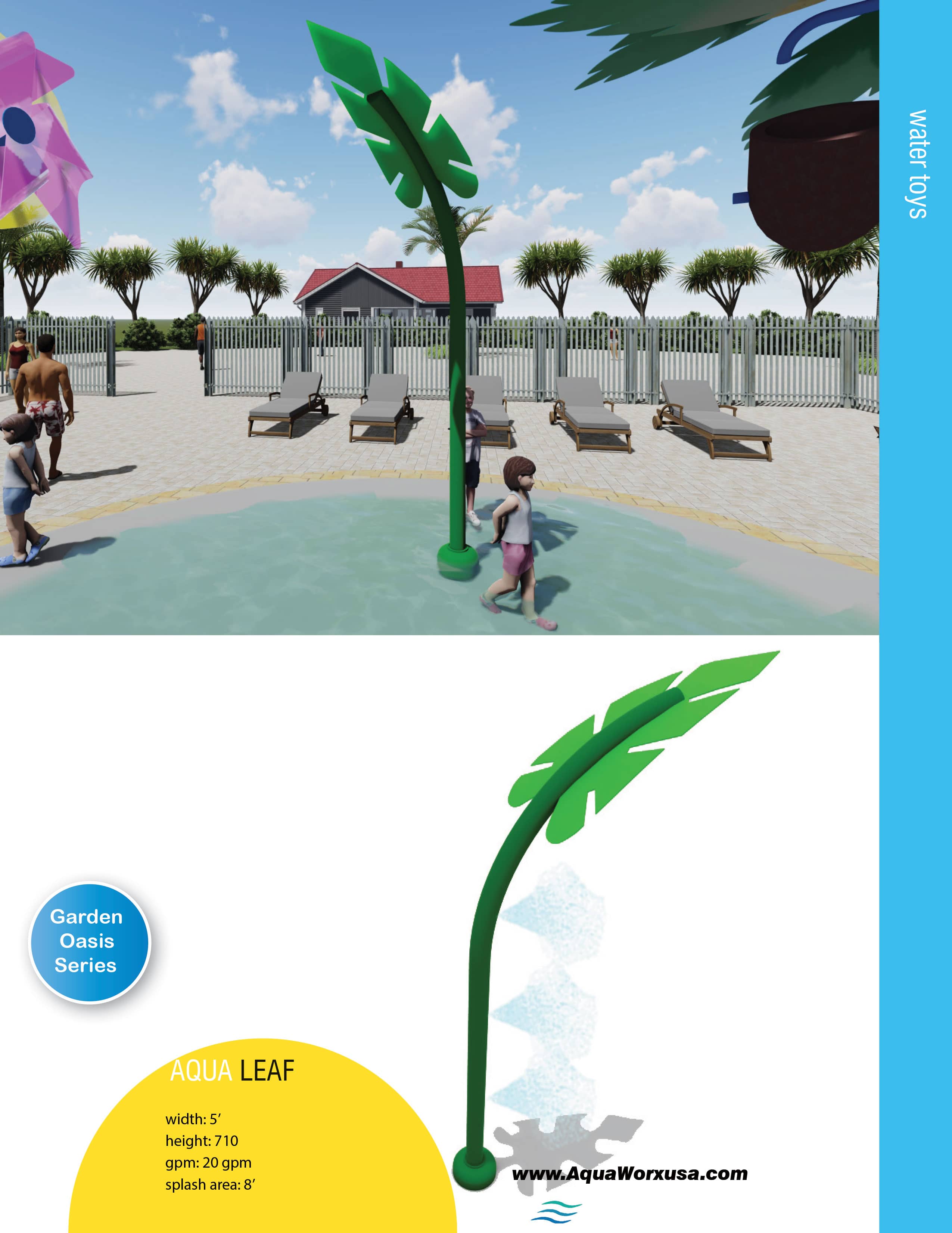 AquaWorx manufactured the swimming pool's interactive water features, including the Aqua Leaf—a leaf-themed aquatic play product from the Garden Oasis Series of Interactive Water Features that blends beautifully into the natural landscape. Two Aqua Leafs are positioned on opposite ends of the beach-entry area, offering cooling mist and visual cohesion. The Aqua Buckets 3, a dynamic set of tipping buckets, create splashes of excitement as they fill and dump water onto patrons below.
